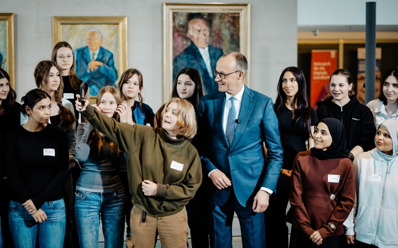 Ein besonderer Moment war die anschließende Gesprächsrunde mit dem Bundeskanzler, in der die Schülerinnen Fragen zu seinem persönlichen Werdegang und zu Zukunftsthemen stellten. Auf die Frage, welche MINT-Berufe künftig besonders wichtig seien, betonte der Bundeskanzler insbesondere Ingenieurberufe in unterschiedlichen Fachrichtungen sowie die Bedeutung von Künstlicher Intelligenz. Gleichzeitig appellierte er daran, jungen Menschen nicht nur akademische Wege, sondern auch berufliche Ausbildungswege stärker in den Blick zu nehmen. Entscheidend sei, Vorurteile in der Gesellschaft und im Elternhaus abzubauen und Kinder bei ihrer Berufswahl nach Begabung und Interesse – nicht nach Geschlecht – zu unterstützen.