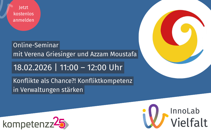 Einladung zum Online-Seminar "Konflikte als Chance?! Konfliktkompetenz in Verwaltungen stärken" am 18.02.2026 von 11 bis 12 Uhr mit Verena Griesinger und Azzam Moustafa. Die Anmeldung ist für alle Interessierten kostenlos.