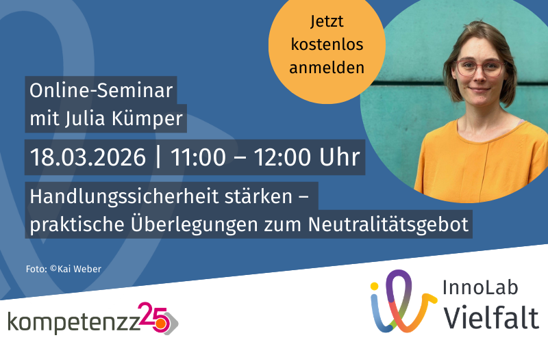 Einladung zum Online-Seminar „Handlungssicherheit stärken – praktische Überlegungen zum Neutralitätsgebot“ am 18.03.2026 von 11 bis 12 Uhr mit Julia Kümper. Die Anmeldung ist für alle Interessierten kostenlos.